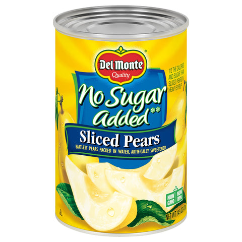 Bartlett pears packed in water, artificially sweetened. No sugar added (Not a low calorie food - see nutrition panel for sugar and calorie content). 1/2 the calories and sugar than sliced pears in heavy syrup. Sliced pears NSA 40 calories, 7 g sugar per serving; sliced pears in heavy syrup 100 calories 21 g sugar per serving. Non GMO (Ingredients of the types used in the product are not genetically modified). Now you can enjoy the same delicious, high quality, great tasting fruit you've come to trust from Del Monte with no added sugar. With Del Monte No Sugar Added, controlling your sugar and calorie intake doesn't mean sacrificing taste! Picked and packed at the peak of ripeness. www.Del Monte.com. Find great recipes at: www.Del Monte.com. Questions or comments? Call 1-800-543-3090 (Mon.-Fri.). Non BPA (Packaging produced without the intentional addition of BPA). Please recycle. Product of USA.