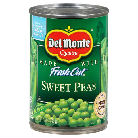 No preservatives. Non GMO (Ingredients of the types used in this product are not genetically modified). With natural sea salt. Quality. Made with Fresh Cut sweet peas. Del Monte Sweet Peas are picked fresh at the peak of flavor, then packed fresh to lock in their plump, sweet taste and nutrients. With no preservatives, artificial colors or flavors, you get unsurpassed taste - Guaranteed! www.Del Monte.com. Questions or comments? Call 1-800-543-3090 (Mon. - Fri.). Please provide code information from the end of can when calling or writing. Visit us at: www.Del Monte.com. Non-BPA (Packaging produced without the intentional addition of BPA). Please recycle. Product of USA.