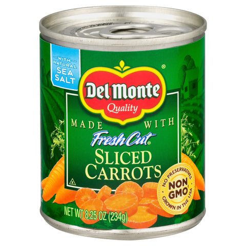 Made with fresh cut sliced carrots. Non GMO (Ingredients of the types used in this product are genetically modified). With natural sea salt. No preservatives. Del Monte Sliced Carrots are picked fresh at the peak of flavor, then packed fresh to lock in their sunny-sweet taste and nutrients. With no artificial flavors or preservatives, you get unsurpassed Del Monte flavor-guaranteed! www.Del Monte.com. Question or Comments? Call 1-800-543-3090 (Mon.-Fri.). Please provide code information from the end of can when calling or writing. Visit us at: www.Del Monte.com. Please recycle. Grown in the USA. Product of USA.