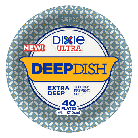 24.2 cm. New! Extra deep to help prevent spills. Dixie Ultra plates and bowls will handle your heavy, messy meals, so you can focus on great conversation and not the dishes. Soak proof shield. Microwaveable. Cut resistant. www.dixie.com. Like us on Facebook: DixieProducts. Follow us on Twitter: (at)DixieProduct. Follow us on Instagram: (at)dixie. Visit us on Pinterest: pinterest.com/dixieproducts. Connect with Dixie. www.dixie.com. If you have any questions or comments, please call toll-free 1-800-2Tellgp. Made in the USA with domestic and foreign materials for Georgia-Pacific Consumer Products.