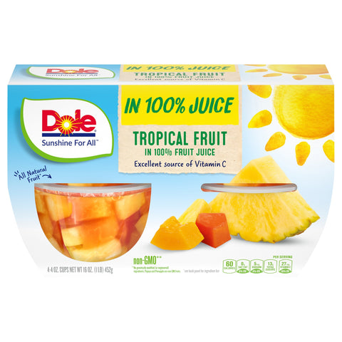 Per Serving: 60 calories; 0 g sat fat (0% DV); 5 mg sodium (0% DV); 13 g total sugars. 27 mg vitamin C (30% DV). Excellent source of vitamin C. Non-GMO (No genetically modified (or engineered) ingredients. Papaya and pineapple are non-GMO fruits). All natural fruit (See back panel for ingredient list). In 100% juice. We believe in Sunshine for All. It's our promise to provide everyone, everywhere with good nutrition! Full of Sunshine: Bring sunshine with you wherever you go - Dole Fruit Bowls seal in goodness and nutrition. Vitamin C is an antioxidant that helps support a healthy immune system. Who knew vitamins were so delicious? Satisfaction Guarantee: Call 1-800-232-8888. dolesunshine.com. Learn more at dolesunshine.com. Please recycle. For more than 100 years, Dole has been committed to our environment, our associates and the communities in which we operate. To learn how, please visit dolesunshine.com/sustainability.