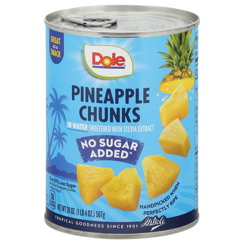 Pineapple chunks in water sweetened with stevia extract. 50 calories per serving. Gluten free. Vegan. No sugar added (Not a low calorie food. See nutrition facts for sugar and calorie content). Over 50% less sugar than Dole pineapple chunks in heavy syrup (10 g sugar vs 25 g sugar per serving in our pineapple chunks in heavy syrup). Boost of natural antioxidant vitamin C. Non GMO. Handpicked when perfectly ripe. Tropical goodness since 1901. We pick, trim, and pack the fruit perfectly. Now all you need to do is peel back the lid for