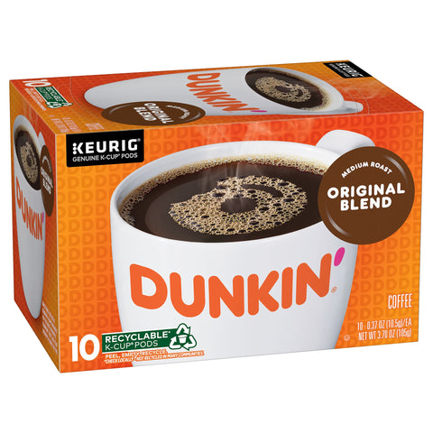 100% Premium Arabica coffee. Keurig genuine k-cup pods. It's a success story that started in 1950 as a single donut shop in Quincy, Massachusetts, and now includes over 9,500 shops. Sure, Dunkin' has been known for its donuts over the years, but it's our coffee that's kept America running. And just what kind of brew could create such a stir? Open this box and find out. Original Blend is the coffee that made Dunkin' famous, featuring a rich, smooth taste unmatched by others. Brew yourself a cup and enjoy the great taste of Dunkin' at home. Only Genuine K-Cup Pods are optimally designed by Keurig for your Keurig coffee maker to deliver the perfect beverage in every cup. To learn more, visit Keurig.com/GenuineK-CupPod. dunkinathome.com. www.keurig.com. how2recycle.info. Find us on Facebook.com/Keurig or Twitter.com/Keurig. Visit dunkinathome.com for more information. For comments or questions, call 1-800-374-5308. For more information about Dunkin' at Home products contact: The J.M. Smucker Company, Orrville, OH 44667 USA 1-800-374-5308 / dunkinathome.com. For brewer inquiries contact: Keurig Green Mountain, Inc. 1-866-901-BREW / 1-866-901-2739, www.keurig.com. Love this coffee? Try our other delicious varieties. This carton is made with recycled material. Peel: Starting at puncture, peel lid and dispose. Empty: Compost or dispose of grounds. (Filter can remain). Recycle: Check locally (Not recycled in all communities) to recycle empty cup. Visit Keurig.com/recyclable to learn more. Please recycle.