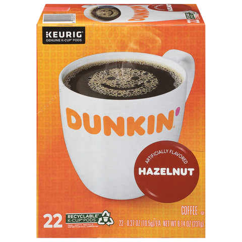 Artificially flavored. 100% Arabica coffee. It's a success story that started in 1950 as a single donut shop in Quincy, Massachusetts, and now includes over 9,500 shops. Sure, Dunkin' has been known for its donuts over the years, but it's our coffee that's kept America running. And just what kind of brew could create such a stir? Open this box and find out. The rich, smooth taste of Dunkin' Original Blend with the flavor and aroma of sweet roasted hazelnuts. Brew yourself a cup and enjoy the great taste of Dunkin' at home. Keurig.com/GenuineK-CupPod. dunkinathome.com. www.Keurig.com. how2recycle.info. Find us on Facebook.com/Keurig or Twitter.com/Keurig. Love this coffee? Try our other delicious varieties. Visit dunkinathome.com for more information. For comments or questions, call 1-800-374-5308. To learn more, visit Keurig.com/GenuineK-CupPod. For more information about Dunkin' at home product contact: The J.M. Smucker Company Orrville, OH 44667 USA. 1-800-374-5308 / dunkinathome.com. For brewer inquiries contact: Keurig Green Mountain, Inc. 1-866-901-BREW / 1-866-901-2739. www.keurig.com. Visit keurig.com/recyclable to learn more. Keurig Genuine K-Cup Pods: Only Genuine K-Cup Pods are optimally designed by Keurig for your Keurig coffee maker to deliver the perfect beverage in every cup. To learn more, visit Keurig.com/GenuineK-CupPod. This carton is made with recycled material. Recyclable (not recycled in all communities) K-Cup Pods. Peel, empty, recycle. Peel: Starting at puncture, peel lid and dispose. Empty: compose or dispose of grounds. (filter can remain.). Recycle: check locally (not recycled in all communities). to recycle empty cup.