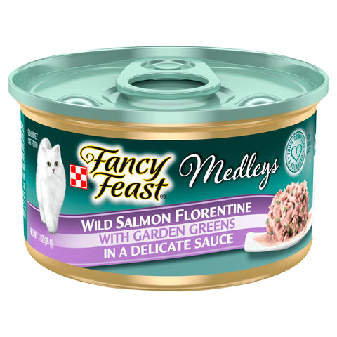 Wild salmon florentine with garden greens in a delicate sauce. 100% complete & balanced. For adult cats. Purina.com. FancyFeast.com/Ingredients. Every ingredient has a purpose. FancyFeast.com/Ingredients. Please recycle. Calorie Content (calculated): 846 kcal/kg; 72 kcal/can. Fancy Feast Medleys Wild Salmon Florentine is formulated to meet the nutritional levels established by the AAFCO Cat Food Nutrient Profiles for maintenance of adult cats.