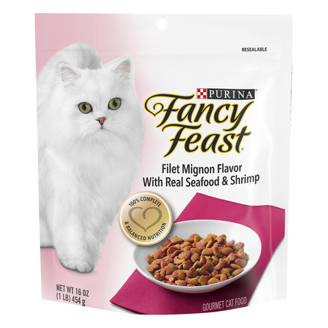 With real seafood & shrimp. 100% complete & balanced nutrition. Crunch delightfully crunch savory deliciously savory completed naturally complete & balanced. Make every day delicious. Fancy Feast believes the right ingredients can make an ordinary day extraordinary. Fancy Feast Dry Cat Food is prepared with a high standard of taste, nutrition and quality for an experience that will excite your cat any time, every day. Delicately crunchy deliciously tasty. Purina.com. FancyFeast.com. Find more to love at fancyfeast.com. Resealable. Crafted in USA facilities. Calorie content (calculated)(ME) 3964 kcal/kg, 471 kcal/cup. Fancy feast filet mignon flavor with real seafood & shrimp is formulated to meet the nutritional leaves established by the AAFCO Cat Food nutrient profiles for all life stages.