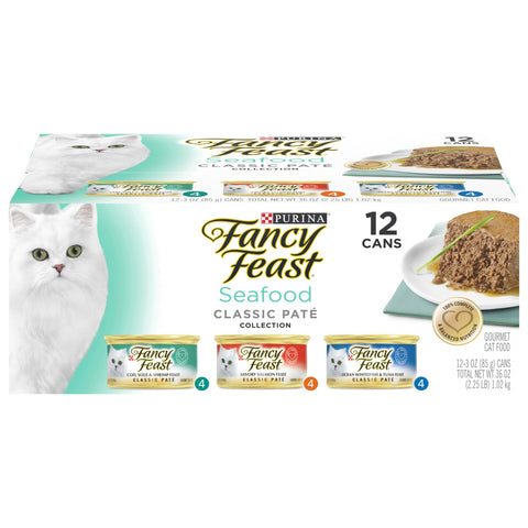 4 Fancy Feast cod, sole & shrimp feast classic pate. 4 Fancy Feast savory salmon feast classic pate. 4 Fancy Feast ocean whitefish & tuna feast classic pate. 12 cans. 100% Complete & balanced nutrition. Purina: Your pet, our passion. The Purina Promise: Pets are our passion. Safety is our promise. Progress is our pledge. Follow us at Purina.com. Purina.com. how2recycle.info. Twitter. Facebook. We’re listening. Visit us online at Purina.com or call 800-933-0991. Every ingredient has a purpose. FancyFeast.com/ingredients. Printed in USA. Crafted in USA facilities. (4 Cans Classic Pate Cod, Sole & Shrimp Feast): Calorie Content (calculated): 964 kcal/kg; 82 kcal/can. Fancy Feast Classic Pate Cod, Sole & Shrimp Feast, Fancy Feast Classic Pate Savory Salmon Feast and Fancy Feast Classic Pate Ocean Whitefish & Tuna Feast are formulated to meet the nutritional levels established by the AAFCO Cat Food Nutrient Profiles for all life stages. (4 Cans Classic Pate Savory Salmon Feast): Calorie Content (calculated): 1086 kcal/kg; 92 kcal/can. Fancy Feast Classic Pate Cod, Sole & Shrimp Feast, Fancy Feast Classic Pate Savory Salmon Feast and Fancy Feast Classic Pate Ocean Whitefish & Tuna Feast are formulated to meet the nutritional levels established by the AAFCO Cat Food Nutrient Profiles for all life stages. (4 Cans Classic Pate Ocean Whitefish & Tuna Feast): Calorie Content (calculated) 997 kcal/kg 85 kcal/can. Fancy Feast Classic Pate Cod, Sole & Shrimp Feast, Fancy Feast Classic Pate Savory Salmon Feast and Fancy Feast Classic Pate Ocean Whitefish & Tuna Feast are formulated to meet the nutritional levels established by the AAFCO Cat Food Nutrient Profiles for all life stages.