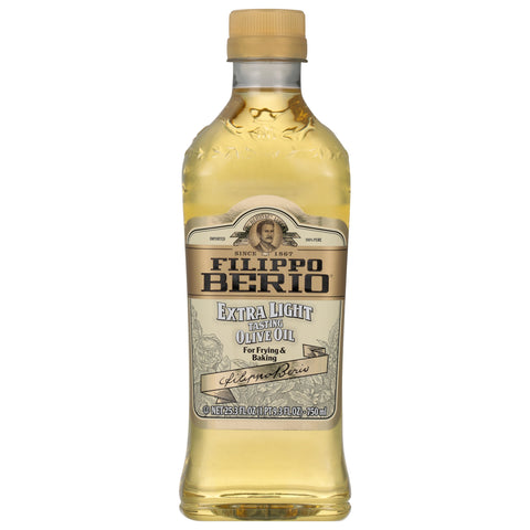 Extra light tasting olive oil. Imported. 100% pure. Since 1867.For frying & baking. - Filippo Berio. Filippo Berio Olive Oils meet or exceed the International Olive Council's stringent worldwide scientific and sensory standards for quality and authenticity. Food safe. NAOOA Certified Quality. AboutOliveOil.org. www.filippoberio.com. 100% recyclable bottle, made with 50% recycled plastic (excluding cap and label). Packed in Italy with select olive oils from Greece, Italy, Portugal, Spain and Tunisia.