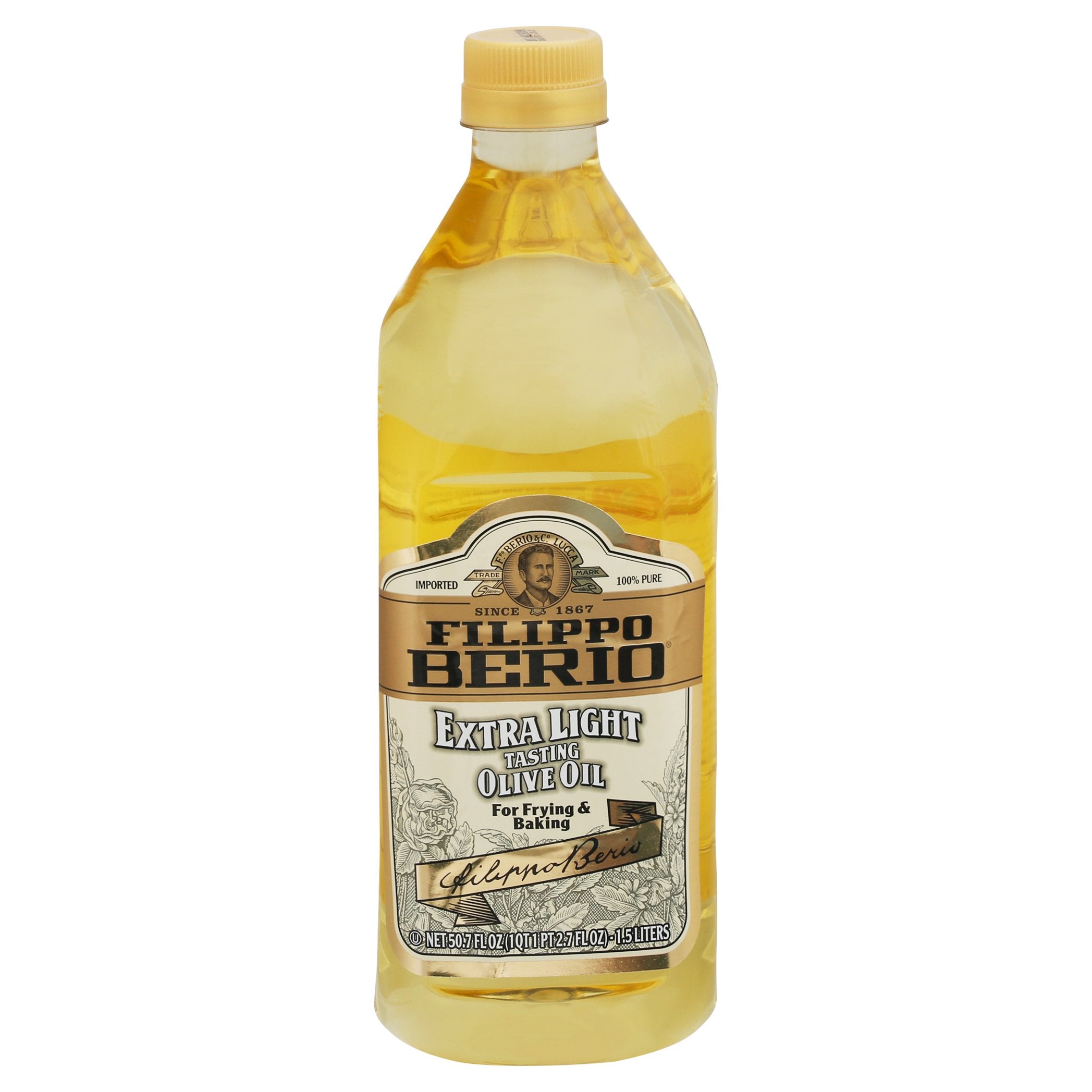 Extra light tasting olive oil. Imported. 100% pure. Since 1867.For frying & baking. - Filippo Berio. Filippo Berio Olive Oils meet or exceed the International Olive Council's stringent worldwide scientific and sensory standards for quality and authenticity. Food safe. NAOOA Certified Quality. AboutOliveOil.org. www.filippoberio.com. 100% recyclable bottle, made with 50% recycled plastic (excluding cap and label). Packed in Italy with select olive oils from Greece, Italy, Portugal, Spain and Tunisia.