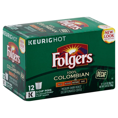 New look same great taste. Decaf. 100% Colombian. For use in all Keurig K-Cup brewers. 100% Arabica coffee. A full-bodied decaffeinated roast with rich flavors and vibrant aromas. A lively experience with every sip. 100% Colombian coffee (Trademark registered by the Colombian Coffee Growers Federation - FoNC). This package is recyclable. For more information about The Folger Coffee Company products contact: The Folger Coffee Company, Orrville, OH 44667 USA. 1-800-937-9745/folgers.com. For brewer inquiries contact: Keurig Green Mountain, Inc. 1-866-901-BreWith 1-866-901-2739. www.Keurig.com. Find us on Facebook.com/Keurig or Twitter.com/Keurig. Enjoy the Trusted Taste of Folgers: Spend more time enjoying your favorite cup of Folgers coffee with our Keurig K-Cup pods. Rich, pure flavor and classic aroma you love, conveniently brewed with the touch of a button. It's the perfect way to start your day. Printed in the USA.