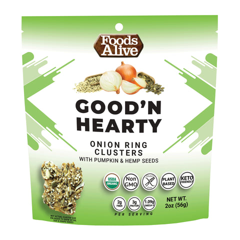 Say hello to onions with a purpose and goodbye to greasy fried onions! Snacking can be healthy when it supplies you with protein, fiber, and Omega EFAs. Good'N Hearty Onion Ring Clusters start with field-fresh organic yellow onions that are smothered with a batter made of nutrient-rich pumpkin, sunflower, sesame and hulled hemp seeds with a sprinkling of Reishi mushrooms. Once they're finished dehydrating at a low temperature, you're left with an outlandishly delicious and nutritious whole food snack. Besides snacking on these straight from the bag, you can use them like croutons on your next salad with one of our gourmet superfood salad dressings.Ingredients
