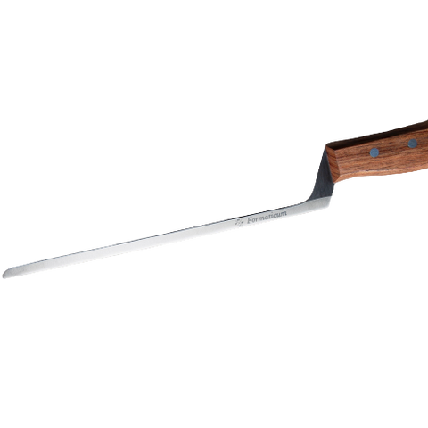 Formaticum professional cheese knives are the highest quality cheese tools. Handmade in Italy, these knives feature stainless steel blades and solid walnut handles. The offset handle design makes it easy to use and result in clean, professional cuts every time. This blade is designed as a blue cheese knife and will easily cut blue cheese without making a mess. The thin blade prevents sticking. Formaticum professional cheese knives should always be hand washed. Blade measures 8" long x 0.25" wide.