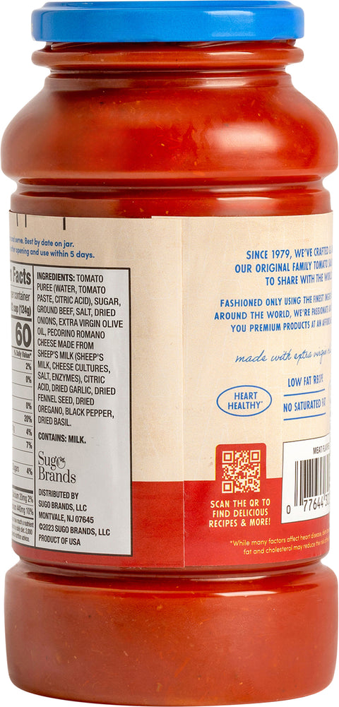 Tomato Puree (Water, Tomato Paste, Citric Acid), Sugar, Ground Beef, Salt, Dried Onions, Extra Virgin Olive Oil, Pecorino Romano Cheese Made from Sheep's Milk (Sheep's Milk, Cheese Cultures, Salt, Enzymes), Citric Acid, Dried Garlic, Dried Fennel Seed, Dried Oregano, Black Pepper, Dried Basil.