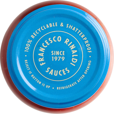 Made with imported pecorino romano & extra virgin olive oil. Made by Italians. 100% recyclable. Lighweight. Shatterproof. Francesco Rinaldi introduces living jar. For delicious recipes and our family story, visit FrancescoRinaldi.com. Our original secret spice blend, formulated in our family's hometown of Tusa, Sicily, has remained unchanged. Thoughtfully selected imported ingredients, carefully blended and dried in the sunshine, add that something extra special to our recipe, which we proudly say is made by Italians - our family's American dream come true. Each 1/2 Cup Serving of Sauce Has: 2 servings of veggies (Each 1/2 cup serving of sauce provides 1 cup equivalent of vegetables. The 2010 Dietary Guidelines for Americans recommend 2-1/2 cups of a variety of vegetables per day for 2,000 calorie diet); gluten free; low fat. Facebook. Twitter. Pinterest. Francesco Rinaldi pasta sauce is packaged in a jar designed with your lifestyle in mind. Easier to handle. Same amount of sauce. Just as fresh! Eliminates heavy glass jars & clink in the grocery bag. No more glass breakage. Ease of handling & shatterproof design lets kids help in the kitchen! A revolutionary breakthrough in the sauce aisle. (hashtag)getsaucy. Product of USA.