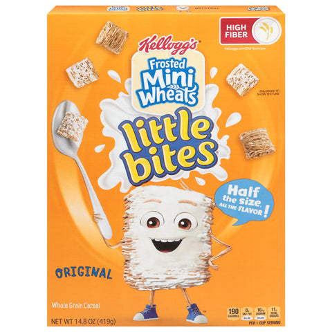 Per 1 Cup Serving: 190 calories; 0 g sat fat (0% DV); 10 mg sodium (0% DV); 11 g total sugars. Whole grain cereal. Packed with 45 g of whole grains. High fiber. Half the size, all the flavor! Profile: Mini (at)frostedminiwheats. Motto: I’m here to stick with you. (It’s kinda what I do!). About: I’m Mini. You’re you. And we’re about to seize the day! Packed with 45 g whole grains we’re going to do big things together. Snack attack? I have 100% whole wheat so I got your back! Half the size, but still mighty - it’s what’s om the inside that counts! 1000% here to make your day! BCTGM Union Made: Bakery Confectionery Tobacco Workers & Grain Millers. wkkellogg.com. how2recycle.info. kelloggs.com/didyouknow. Kellogs.com/DidYouKnow. Mini (at)frostedminiwheats. Did You Know: Kelloggs.com/DidYouKnow. Questions or comments? Visit wkkellogg.com. Call 1-800-962-1413. Certified 100% recycled paperboard.