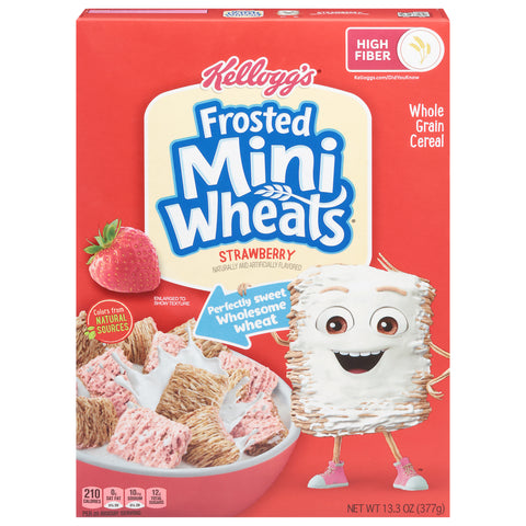 Whole grain cereal. Naturally and artificially flavored. Per 25 Biscuit Serving: 210 calories; 0 g sat fat (0% DV); 10 mg sodium (0% DV); 12 g total sugars. High fiber. Kelloggs.com/DidYouKnow. Perfectly sweet wholesome wheat. Colors from natural sources. Profile: Mini (at)frostedminiwheats. Motto: I’m here to stick with you. (It’s kinda what I do!). About: I’m Mini. You’re you. And we’re about to seize the day! Conquer the day with the flavor of strawberries & the power of whole grain. I have 100% whole wheat & am 1000% dedicated to your day! They made me with 10 layers of awesomeness so we can do big things together. Packed with juice strawberry flavor. kelloggs.com. how2recycle.info. Mini (at)frostedminiwheats. Did You Know: Kelloggs.com/DidYouKnow. Questions or comments? Visit wkkellogg.com. Call 1-800-962-1413. Certified 100% recycled paperboard. Product of Canada.