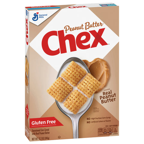 Sweetened corn cereal with real peanut butter. No artificial colors or flavors. Per 1 Cup: 170 calories; 1 g sat fat (4% DV); 270 mg sodium (12% DV); 9 g total sugars. See nutrition facts for as prepared information. Gluten free. 12 g whole grain per serving at least 48 g recommended daily. No high fructose corn syrup. Contains bioengineered food ingredients. Learn more at Ask.GeneralMills.com. Made with real peanut butter. This package is sold by weight, not by volume. You can be assured of proper weight even though some settling of contents normally occurs during shipment and handling. generalmills.com. how2recycle.info. Pinterest. For more homemade Chex recipes, visit the Chex pinterest page or go to Chex.com. We welcome your questions and comments generalmills.com 1-800-328-1144. Proud sponsor of Celiac Disease Foundation celiac.org. Box Tops for Education. No more clipping. Scan your receipt see how at btfe.com. Corn Chex; Rice Chex; Peanut Butter Chex; Chocolate Chex; Honey Nut Chex; Cinnamon Chex; Wheat Chex. 100% recycled paperboard.
