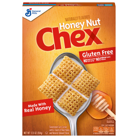 Sweetened corn cereal with a touch of real honey and natural almond flavor. Naturally flavored. No artificial colors or flavors. Per 1 Cup Serving: 170 calories; 0 g sat fat (0% DV); 270 mg sodium (12% DV); 12 g total sugars. 14 g whole grain per serving. At least 48 g recommended daily. Gluten free. No high fructose corn syrup. See nutrition facts for as prepared information. Contains bioengineered food ingredients. Learn more at Ask.GeneralMills.com. Full of possibilities. Cooking gluten free? Look for gluten free ingredient substitutes and always read labels to make sure that each recipe ingredient is gluten free. Products and ingredient sources can change. This package is sold by weight, not by volume. You can be assured of proper weight even though some settling of content normally occurs during shipment and handling. generalmills.com. how2recycle.info. Pinterest. We welcome your questions and comments. generalmills.com. 1.800.328.1144. For more homemade Chex recipes visit the Chex pinterest page of Chex.com. Proud Sponsor of Celiac Disease Foundation. celiac.org. Box Tops for Education: No more clipping. Scan your receipt. See how at btfe.com. Chex Corn; Chex Rice; Chex Peanut butter; Chex Chocolate; Chex Honey nut; Chex Cinnamon; Chex Wheat. 100% recycled paperboard. Recyclable.