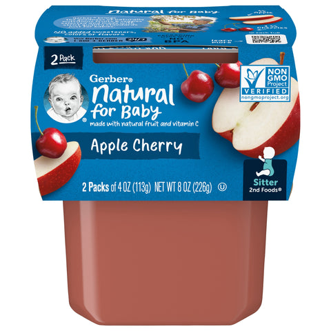Sitter. No added sweeteners, colors or flavors. Non GMO Project verified. nongmoproject.org. 2nd foods. Gerber brings the goodness of naturally nutritious fruits & veggies selected and made with strict quality standards just for babies. 3/5 apple; 1-3/4 cherries in each tub. Inner units not labeled for retail sale. gerber.com. Learn more. Visit Gerber.com 1-800-4-Gerber 24/7. Packaging made with no BPA.