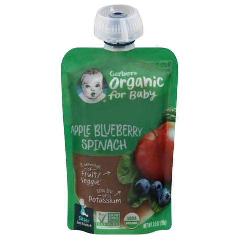 Sitter. 2 Servings of fruit/veggie (1 fruit/veggie serving is 3 tbsp for babies). 10% DV of potassium. USDA Organic. Certified Organic by Oregon Tilth. Non-GMO Project verified. nongmoproject.org. Gerber Organic for Baby we only use Organic Certified Farms that respect nature's own rhythm and place. As a Mom, it is reassuring knowing how much effort goes into making my child's food. - Andrea H. Gerber Agricultural Specialist. 1/2 Apple, 1/2 spinach leaf, 16 blueberries in each pouch. MyGerber.com. Gerber.com/sustainability. nongmoproject.org. Visit Gerber.com to chat with a MyGerber Baby Expert 1-800-4-GERBER. Recycle through TerraCycle. We Care for the Planet - Our pouch is recyclable through TerraCycle. Visit Gerber.com/sustainability to learn more.