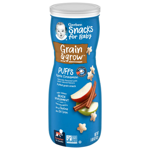 8+ months. Puffed grain snack. Naturally flavored with other natural flavors. Just goodness: no artificial flavors or artificial sweeteners. Helps support brain development and leaning agility: 30 mg choline; 20% DV iron. Non GMO Verified project. nongmoproject.org. Grain & grow. Baby-Led friendly snacks can encourage your little one's independence while exploring new textures and developing feeding skills. Melts quickly! A First Finger Food that is Melt-in-their-mouth good. Perfectly sized pieces, easy to pick up, and help develop baby's pincer grasp for self-feeding. Crawler; 8+ months: Your baby may be ready for Puffs if they: Crawl without tummy on the floor. Start using fingers to eat. Start using jaw to mash food. Gerber Grain & grow brings the goodness of whole grains and tailored nutrition. Gerber Grain & grow Puffs have 20% DV of Iron and 30 mg choline per serving for your little one to support brain development and learning ability. This package is sold by weight, not by volume, and my not appear full due to settling of contents. Gerber.com. how2recycle.info. Learn more. Visit Gerber.com to chat with a MyGerber Baby Expert 1-800-4-GERBER. 24/7.