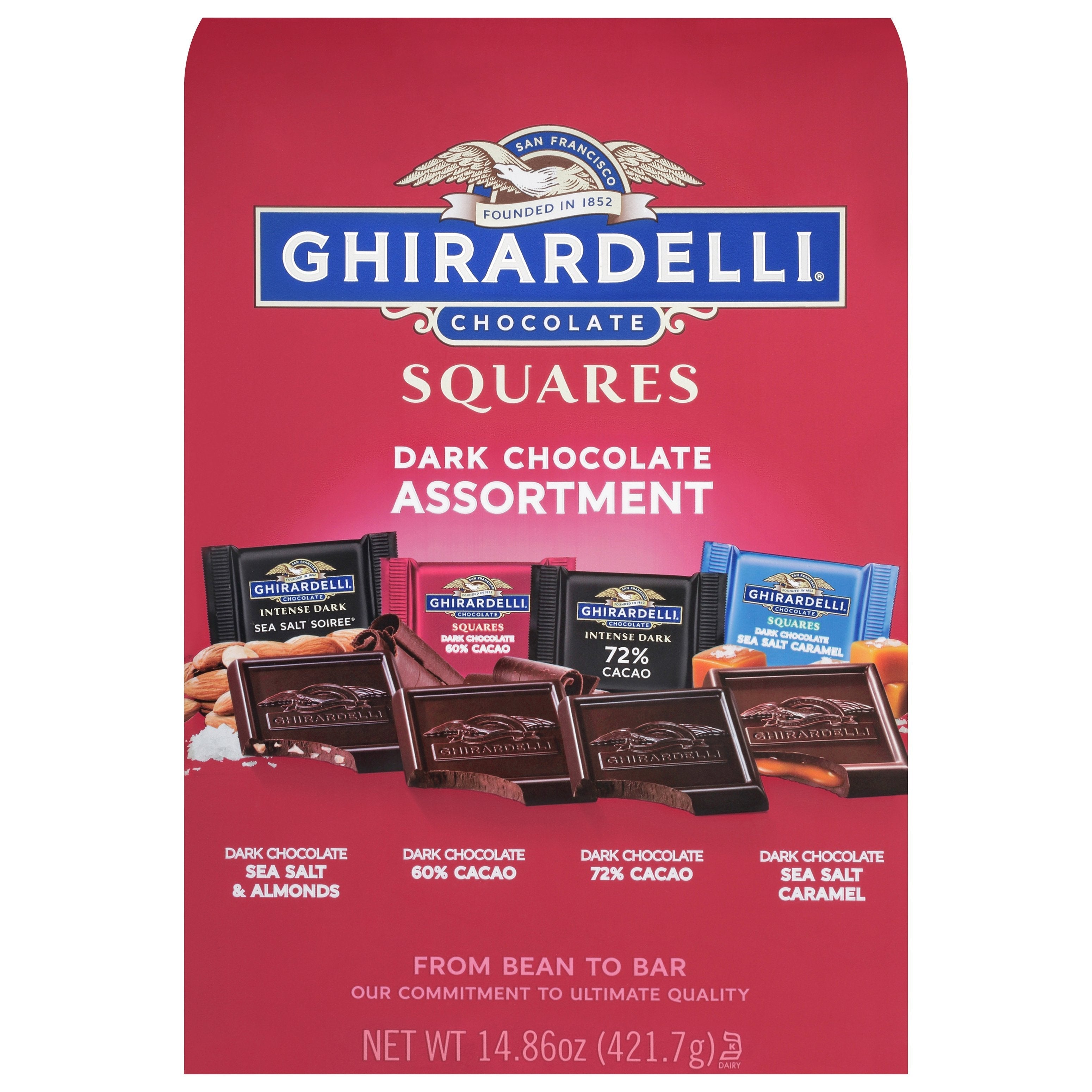Dark Chocolate Sea Salt & Almonds. Dark Chocolate 60% Cacao. Dark Chocolate 72% Cacao. Dark Chocolate Sea Salt Caramel. San Francisco. Founded in 1852. From bean to bar. Our commitment to ultimate quality. Experience our slow-melting dark chocolate in this collection of luscious and indulgent flavors. Discover the Ghirardelli Difference: Select high quality beans. Roast nibs for intensity. Refine for smoothness. Conche for flavor. Ghirardelli of San Francisco since 1852. Product sold by weight, not by volume or count flavor assortment may vary. Contents may settle during shipping. Cocoa Farming Program: For more information. About our ingredients and sustainable sourcing visit ghirardelli.com/sustainability.