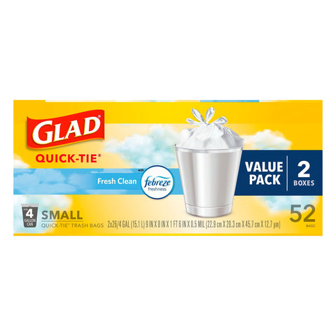 Glad Febreze Fresh Clean 4 Gallon Small Quick-Tie Trash Bags - 52 CT 4 Pack