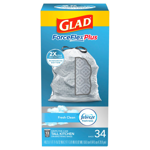 Glad ForceFlex Plus Febreze Fresh Clean 13 Gallon Tall Kitchen Drawstring Bags - 34 CT 6 Pack