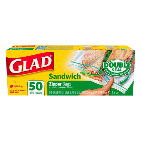 50 sandwich size bags 6-5/8 in x 5-7/8 in (16.8 cm x 14.9 cm). Double seal locks in freshness, guarantee. lad and Glad-Lock - the names you've grown to trust. www.glad.com. how2recycle.info. See our website www.glad.com for more ways to use Glad bags. Questions or comments? Visit our website or give us a call. www.glad.com. 1-800-835-4523. Carton made with 100% recycled paperboard. Minimum 35% post consumer content. BPA free. Made in the USA.