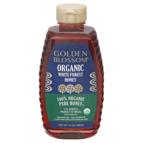 100% organic pure honey. USDA Organic. Naturally gluten free. Certified Organic by Quality Assurance International. Sourcing our Brazilian honey primarily from an unspoiled region called The White Forest helps create opportunities for the local population and encourages preservation of the native habitat. Golden Blossom Brand White Forest Honey is the tastiest organic honey there is! U.S. Grade A. For questions or comments please email us. 1% for the planet member. Product of Brazil.