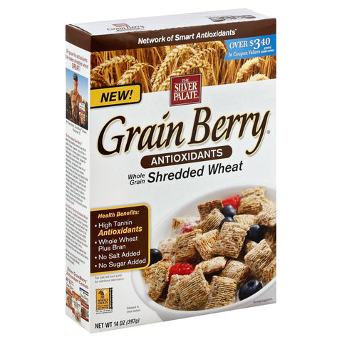 Antioxidants. Health Benefits: High tannin antioxidants; whole wheat plus bran; no salt added; no sugar added. Network of smart antioxidants. Over $3.40 in coupon values printed inside carton. New! See side and back panel for nutritional information. Whole Grain: 45 g or more per serving. Eat 48 g or more of whole grains daily. WholeGrainsCouncil.org. Per 1 Cup Serving: 190 calories; 0 g sat fat (0% DV); 0 mg sodium (0% DV); 0 g sugars. Can tannin antioxidants help with weight control? I'm proud to offer this new and unique Grain Berry Shredded Wheat with no refined sugar, no salt, whole grain special wheat plus our high tannin sorghum bran we call Heart Grains This special bran enhances the natural fiber content for digestive health plus a network of antioxidants (along with vitamins C and E). What first attracted me to high tannin sorghum was its rich source of antioxidants and bioactive compounds. In addition, the fact that the cattle and chickens who ate it, seemed to not put on much weight I discussed this with a leading university of agriculture and learned that this was well known to both farmers and scientists alike. A human feeding study by this university seems to be confirming it and this important study is being continued. Of course, Grain Berry offers a lot more than high tannin sorghum bran. It contains whole grain wheat (or oats in the case of our Toasted Oats cereals) as well as the special bran that may well help in weight management. What do antioxidants do for you? If you have access to a computer and the internet, I urge you to check the discussion about antioxidants by leading medical institutions and universities. It is well worth your time to learn about the health benefits of antioxidants. Bottom line, antioxidants, and its helper bioactive compounds, fight the attack of these chemicals called free radicals before they can do serious damage and other very bad things. A leading university of public health states unequivocally that ample evidence suggests that a network of various antioxidants from whole fruits, vegetables and whole grains provide protection against many of the scourges of aging. Thank you, friends, for trying our antioxidant Grain Berry foods. We hope you continue to enjoy using them. Grain Berry's Network of Antioxidants: No single antioxidant or bioactive compound can defend against all free radicals. That's why we suggest an eating plan in our website (www.grainberry.com) to provide a balance of antioxidants. In simple terms, we recommend 3 servings of fruits daily; 3 servings of vegetables and 3 servings of whole grains. Grain Berry goes beyond whole grains with enhanced antioxidants and dietary fiber. - Robert M. Harris, Chairman; Silver Palate Kitchens, Inc. High-Tannin Foods: Tea; walnuts, almonds and nuts with skins; dark chocolate; cinnamon, clove and other spices; pomegranates, grapes and acai berries; quince; red beans. We grow the antioxidants that makes shredded wheat great! - Mr. Glenn Schur, Grain Berry Grower - Plainview, TX. The Story About Grain Berry: Many fine breakfast cereals use whole grains. Some, however, also utilize a high level of refined sugars to enhance taste appeal. Silver Palate, known for elegant food development and preparation, introduced a new line of whole grain reduced-sugar cereals, baking mixes and other grain based foods which we call Grain Berry. Grain Berry went beyond whole grain nutrition and included high tannin sorghum bran in each Grain Berry product in order to enhance natural dietary fiber and the level of natural antioxidants plus bioactive plant food compounds present in phenolic acids. Grain Berry's Simple Shredded Wheat: We chose the shredded wheat format for our newest cereal line in order to provide the benefits of a whole wheat cereal and its health benefits to our customers but, true to our reason for being, we added our special Heart Grains sorghum bran to the whole wheat to continue its simple goodness and yet make it into a distinctive and healthful breakfast food with natural fiber and natural antioxidants. We hope you enjoy our Grain Berry's version of Shredded Wheat - plus antioxidants. For recipes and more visit us at www.silverpalate.com.