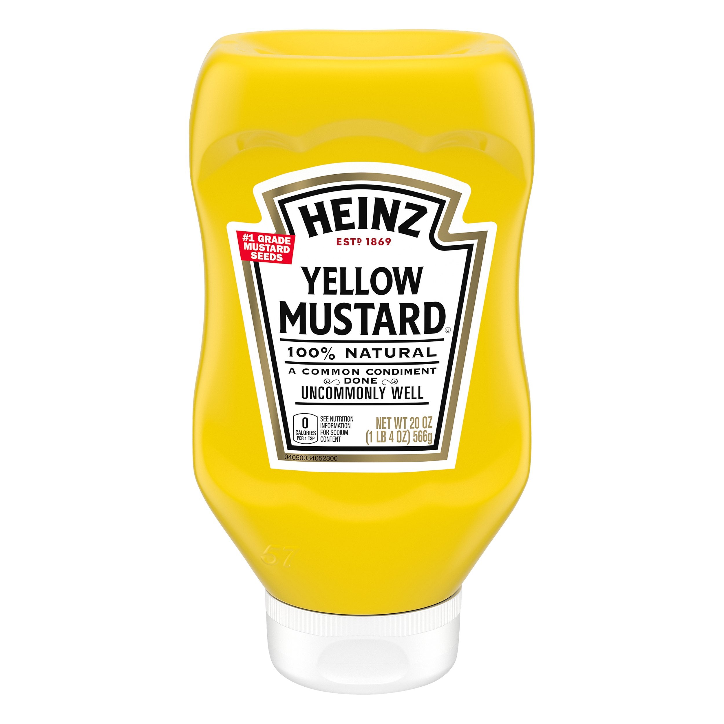0 calories per 1 tsp. See nutrition information for sodium fat content. No. 1 grade mustard seeds. Estd. 1869. 100% natural. A common condiment done. Uncommonly well. Heinz Mustard is made with 100% natural ingredients including stone-ground, No. 1 grade mustard seeds. It comes in an upside-down, ready-to-squeeze bottle for a thick and rich mustard with the perfect balance of flavor and tang. www.heinz.com. Questions or comments? Call 1-800-255-5750.