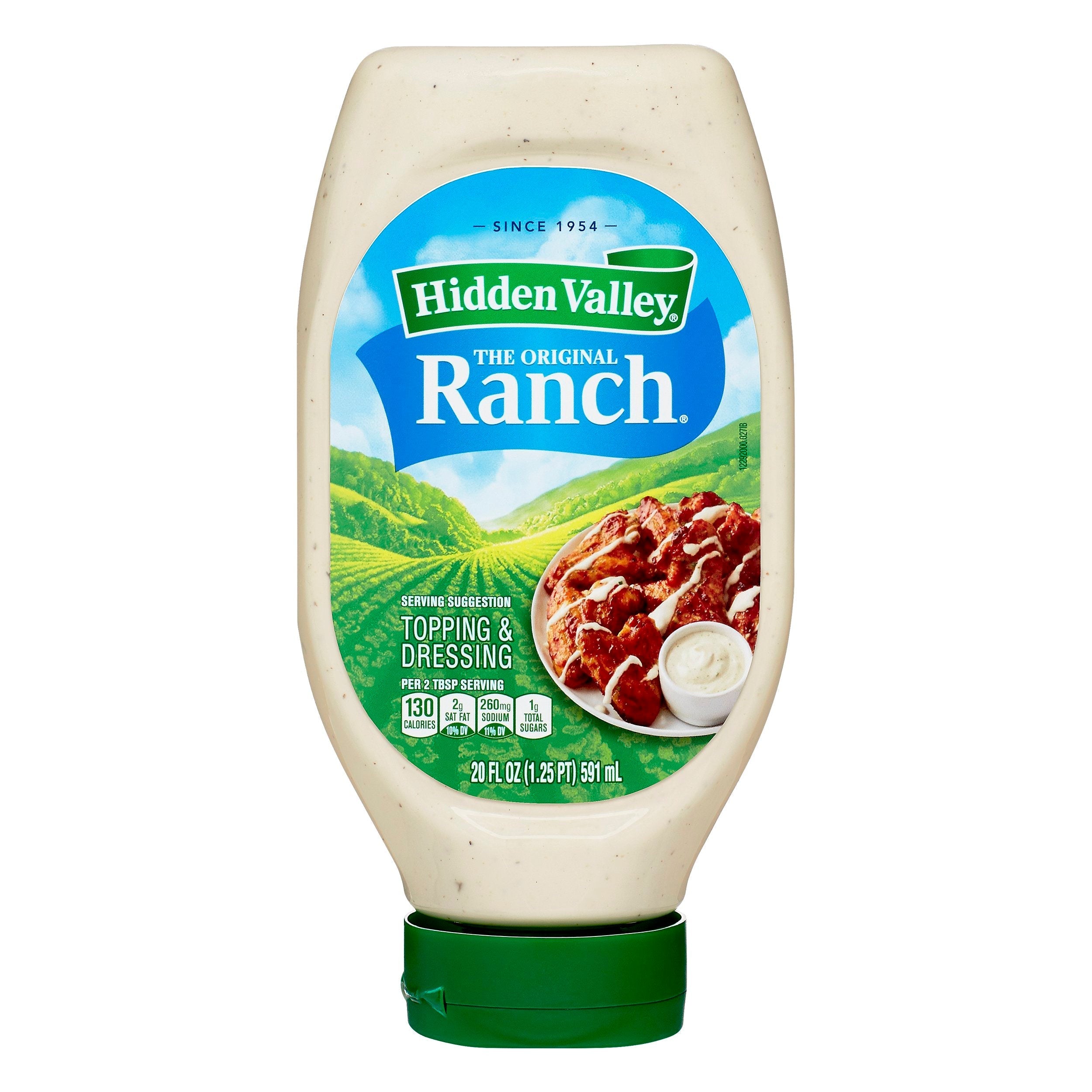 Per 1/4 tsp as packaged: 0 calories; 0 g sat fat (0% DV); 60 mg sodium (3% DV); 0 g total sugars. Gluten free. No preservatives. Since 1954. The Original Ranch. New look - same great flavor for your favorite recipes! Great on chicken, pork, veggies and more! hiddenvalley.com. how2recycle.info. Visit hiddenvally.com for recipes and earn rewards by joining Ranchology Rewards. Questions or comments? Visit hiddenvalley.com or call 1-877-853-7262. For more recipes, visit hiddenvalley.com.