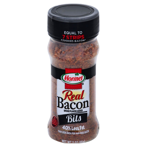 Smoke flavor added. Equal to 7 strips cooked bacon (USDA data for pan-fried bacon). Gluten free. Shake up! Your salads, fresh, vegetables, favorite side dishes and more with Hormel Real Bacon Bits. US inspected and passed by Department of Agriculture. 40% less fat than USDA data for pan-fried bacon. Fat content has been reduced from 2.5 g to 1.5 per serving. Questions, comments or recipes, call 1-800-523-4635. Visit us at www.hormel.com.