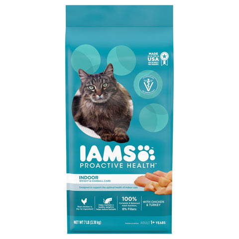 Weight and hairball care. Veterinarians recommended IAMS. Designed to support optimal health of indoor cats. Real chicken is the 1st ingredient. Helps maintain a healthy weight & helps reduce hair balls. 100% complete & balanced adult nutrition, 0% fillers. keeping your cat ready to pounce. Key Benefits in This Recipe: Hairball Care: Proprietary fiber blend, including beet pulp, helps reduce hairballs. Healthy Weight: L-Carnitine to help burn fat and maintain a healthy metabolism. Strong Muscles: Real chicken as the 1st ingredient helps maintain strong muscles. Healthy Heart: Essential nutrients , including calcium & potassium, help nourish a healthy heart. Healthy Skin & Coat: Optimal Omega 6:3 fatty acid ratio for a soft & shiny coat. IAMS Cat Foods Offer a 100% Guarantee: Questions? Comments? Call us at 1-800-625-4267. If you are not satisfied with this product, simply save the unused portion, together with the proof of purchase, and call us. We will gladly replace the product or refund your money. IAMS.com The IAMS Brand knows that each cat is different. That's why we developed recipes nutritionally tailored to meet the specialized needs and life-stages of cats. Discover our full line of IAMS cat food on IAMS.com Made in the USA with the world's finest ingredients. Calorie Content (Calculated): 3364 kcal ME/kg, 302 kcal ME/cup Nutritional Adequacy Statement: IAMS Proactive Health Indoor Weight & Hairball Care with chicken and turkey cat food is formulated to meet the nutritional levels established by the AAFCO Cat Food Nutrient Profiles for adult maintenance.