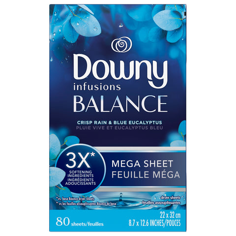 Infusions Mega Dryer Sheets, Laundry Fabric Softener, BALANCE, Crisp Rain and Blue Eucalyptus, 80 Count - 80 CT 4 Pack