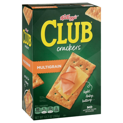 No artificial colors or flavors. Per 4 crackers: 60 calories; 0 g sat fat (0% DV); 140 mg sodium (6% DV); 2 g total sugars. 0 g saturated fat (contains 2.5g total fat per serving.) No cholesterol. See nutrition information for sodium content. Light, flaky, buttery. The perfect crackers for happy snackers. Slicing apples? Spreading cheese? No topping's complete without its cracker. With a buttery and flaky texture, Club makes any pairing a party - and you're invited. Perfect for topping. how2recycle.info. clubcrackers.com. Question or comments? Visit: clubcrackers.com. Call: 1-877-453-5837. Provide production code on package. Kellogg's Family Rewards. Collect points. Earn rewards. Two easy ways to collect points! Go to KFR.com to learn more. Try our minis, perfect for snacking! Snack stacks, perfect for packing!