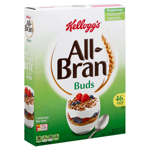 A wheat bran fiber cereal. 46% daily value fiber 11 grams. Per 1/3 Cup Serving: 80 calories; 0 g sat fat (0% DV); 210 mg sodium (9%DV); 8 g total sugars. 61% daily value fiber 17 grams. Good source of 11 essential vitamins & minerals. Simple Inside: Colors and flavors from natural sources. Our best in every bite. Made with high-fiber wheat bran. Bake it with bran. These rich, dense brownies are made with real cocoa and chopped walnuts, for a taste no mix can match. An easy way to help you feel good each day! Help maintain regularity and digestive balance by eating a diet rich in fiber, like the wheat bran in Kellogg's All-Bran Buds cereal. You'll love the taste and enjoy the benefits! This package is sold by weight, not volume. Some settling of contents may have occurred during shipment and handling. BCTGM: Bakery Confectionery Tobacco Workers & Grain Millers. kelloggs.com. all-bran.com. how2recycle.info. For more delicious recipes, visit all-bran.com. Did you Know? Kelloggs.com/DidYouKnow. Questions or Comments? Visit kelloggs.com. Call 1-800-962-1413. Provide production code on package. Kellogg’s Family Rewards: Collect points. Earn rewards. Two easy ways to collect points! Go to kfr.com to learn more. Try our other great varieties! Complete Wheat Flakes; Original. Certified 100% recycled paperboard.