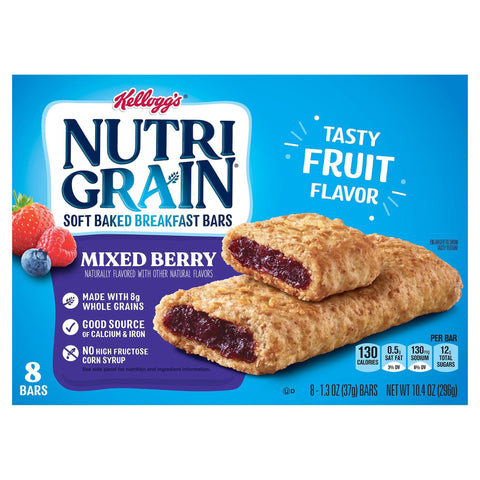 Naturally flavored with other natural flavors. Per Bar: 130 calories; 0.5 g sat fat (3% DV); 130 mg sodium (6% DV); 12 g total sugars. Good source of calcium & iron. No high fructose corn syrup. Contains a bioengineered food ingredient. Tasty fruit flavor. See side panel for nutrition and ingredient information. 8 bars. A perfect pair made with fruit flavor & whole grains. Keep it real! kelloggs.com. Nutrigrain.com. how2recycle.info. Visit: Nutrigrain.com for more information. Questions or Comments? Visit kelloggs.com. Call: 1-800-962-1413. Provide product code on purchase. Join the Fam: Kellogg's Family Rewards. kfr.com. Certified 100% recycled paperboard.