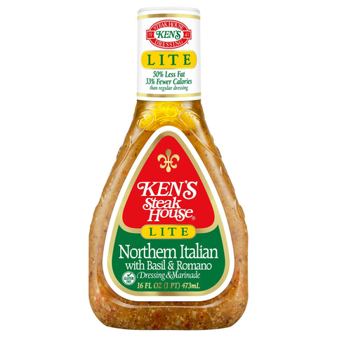Gluten free. 60% less fat. 55% fewer calories than regular dressing. Fat Per Serving: This Product: 4.5 g; Regular Dressing: 12 g. Calories Per Serving: This Product: 50; Regular Dressing: 120. 1941. 24 oz. size. Red bell peppers and sweet basil blend perfectly with Romano cheese to make Ken's Lite Northern Italian a flavor powerhouse that's perfect as a dressing or marinade. Ken's a family owned company. Satisfaction guaranteed or your money back from Ken. www.kensfoods.com. Questions/Comments? Please include complete best when purchased by date. Call 1-800-645-5707 M-F 9AM - 5PM EST. www.kensfoods.com. Product of USA.