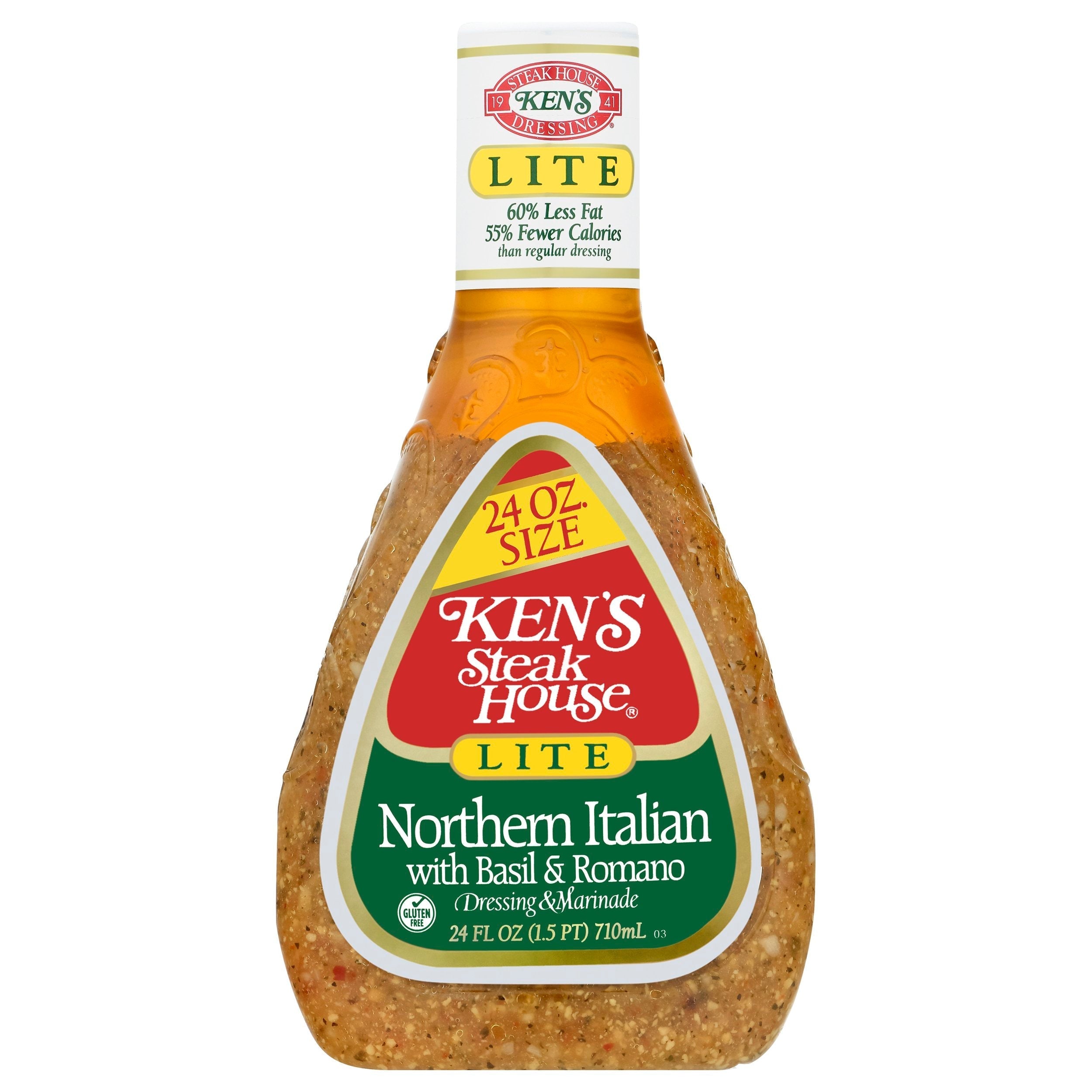 Gluten free. 60% less fat. 55% fewer calories than regular dressing. Fat Per Serving: This Product: 4.5 g; Regular Dressing: 12 g. Calories Per Serving: This Product: 50; Regular Dressing: 120. 1941. 24 oz. size. Red bell peppers and sweet basil blend perfectly with Romano cheese to make Ken's Lite Northern Italian a flavor powerhouse that's perfect as a dressing or marinade. Ken's a family owned company. Satisfaction guaranteed or your money back from Ken. www.kensfoods.com. Questions/Comments? Please include complete best when purchased by date. Call 1-800-645-5707 M-F 9AM - 5PM EST. www.kensfoods.com. Product of USA.