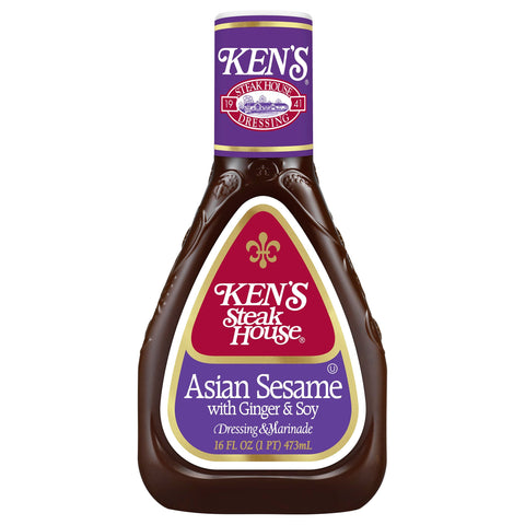 Asian sesame with ginger & soy. Steak house 1941 dressing. A far east classic. Sesame, soy, ginger, garlic and citrus add sparkle to your salads, marinades and stir-fries. Ken's a Family owned company. Satisfaction guaranteed or your money back from Ken. www.kensfoods.com. Questions/Comments? Please include complete best when purchased by date. Call 1-800-645-5707 M-F 9AM-5PM EST. www.kensfoods.com. Product of USA.