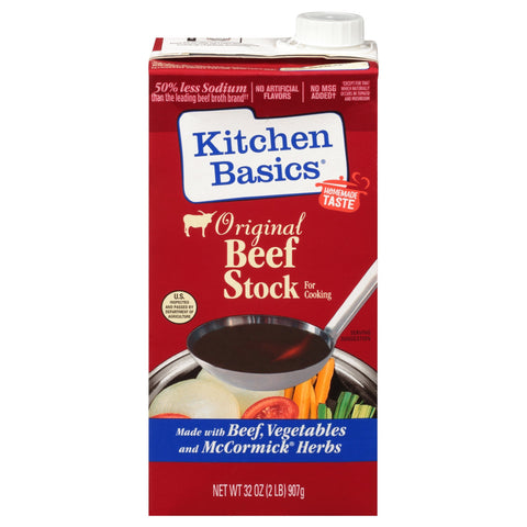 Beef Stock for cooking. No artificial flavors. 50% less sodium than the leading beef broth brand (This product contains 350 mg of sodium per serving. The leading beef broth brand contains 830 mg of sodium). Homemade taste. Kitchen Basics - an American original. Dark & rich - just like homemade. Cooking stock is a central ingredient for soups, sauces and marinades. It is used by many to flavor vegetables, potatoes and rice dishes. But who has the time to make stock from scratch? In 1996, Kitchen Basics first introduced ready-to-use cooking stocks. Our founder's grandmother's recipes were the key inspiration behind our culinary line of cooking stocks. No MSG added (Except for that which naturally occurs in tomato and mushroom). Our Pledge: Guaranteed satisfaction! If you are not happy with any of our products, please call or write. If possible, save box & receipt. U.S. inspected and passed by Department of Agriculture. www.kitchenbasics.net. Quality seal. TetraPak: Protects what's good. A package from Tetra Pak. Tetra Pak: Tetra Prisma aseptic. Packed in USA.