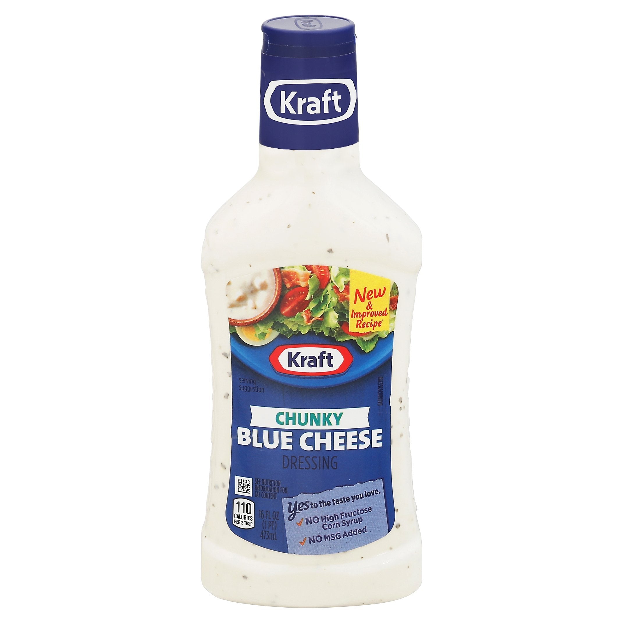 110 calories per 2 tbsp. See nutrition information for fat content. No MSG added. New and improved recipe (as compared to previous Kraft Chunky Blue Cheese dressing). Yes to the taste you love. No high fructose corn syrup. kraftdressings.com. Scan for info. Visit at: kraftheinzcompany.com. 1-800-847-1997 please have package available. Recipes at kraftdressings.com.