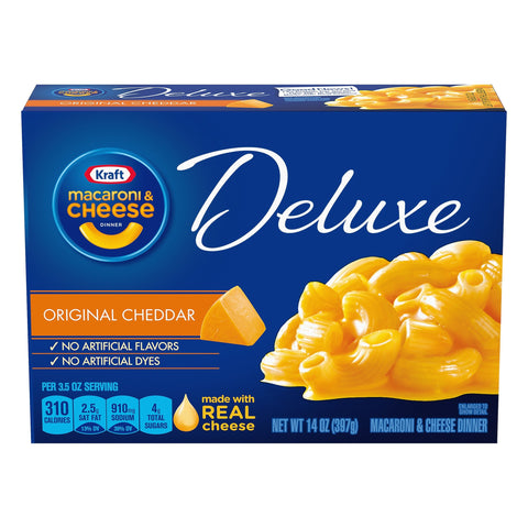 No artificial flavors. Per 3.5 oz Serving: 310 calories; 2.5 g sat fat (13% DV); 910 mg sodium (39% DV); 4 g total sugars. Good News! 12 g protein per serving 15% DV of calcium. See nutrition information for sodium content. Made with real cheese. No artificial dyes. Deluxe taste you know you'll love. It's rich. It's creamy. And it's love at first bite for this delicious dish made with real cheese. Heartier elbow macaroni lets you enjoy more cheese with every bite. This product is sold by weight, not volume, some settling of contents may have occurred during handling. Kraftheinzcompany.com. www.kraftrecipes.com. howrecycle.info. Visit us at: Kraftheinzcompany.com or call us at:1-800-847-1997. For more recipes please visit us at www.kraftrecipes.com.