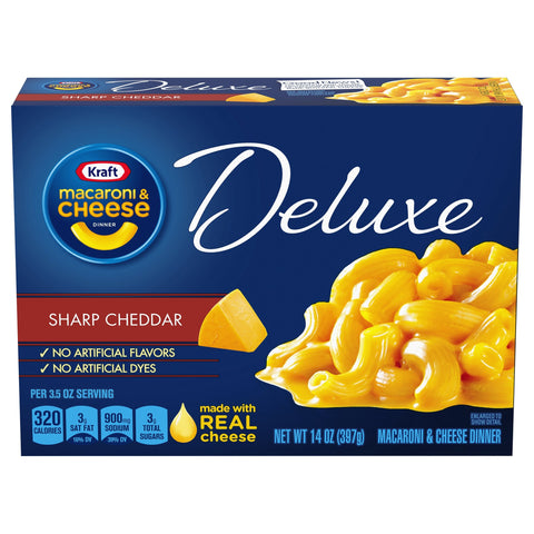 No artificial flavors. Per 3.5 oz Serving: 320 calories; 3 g sat fat (16% DV); 900 mg sodium (39% DV); 3 g total sugars. 12 g protein and 10% DV of calcium per serving made with real cheese. See nutrition information for sodium content. No artificial dyes. Made with real cheese. Deluxe taste you know you’ll love. Sharpen your family's taste buds with a rich and creamy, real sharp cheddar cheese dish you'll always love. Heartier elbow macaroni lets you enjoy more cheese with every bite. This product is sold by weight, not volume. Some settling of contents may have occurred during handling. kraftheinzcompany.com. how2recycle.info. Visit us at: kraftheinzcompany.com or call us at: 1-800-847-1997. For more recipes please visit us at wwvv.kraftrecipes.com.
