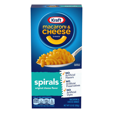 Per 1/2 Box (Unprepared): 250 calories; 1 g (4% DV); 540 mg sodium (24% DV); 9 g total sugars. See nutrition facts panel for as prepared. No artificial preservatives. No artificial dyes. Even more reasons to love it. This box of Kraft macaroni & cheese dinner may look simple, but it actually contains some extraordinary things. Inside you'll find happy childhood memories, tons of blissful smiles and our delicious spiral noodles waiting to be covered with gooey, cheesy goodness. And now, there are a few things you won't find. Our mouthwatering mac and cheese now contains no artificial flavors, preservatives or dyes. Of course, it still has the great taste you know and love. Which means you can happily devour it bite by bite, until your bowl contains nothing at all. This product sold by weight; not by volume. Some settling of contents may have occurred during handling. kraftheinzcompany.com. kraftmacandcheese.com. Visit us at: kraftheinzcompany.com; 1-800-847-1997. Please have package available.