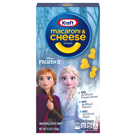 No artificial flavors. Per 1/2 Box Unprepared: 250 calories; 0.5g sat fat (4% DV); 480 mg sodium (21%DV); 7g total sugars. See nutrition facts panel for as prepared. No artificial preservatives. No artificial dyes. This product sold by weight; not volume. Some settling of contents may have occurred during handling. Even more reasons to love Kraft Macaroni & Cheese dinner! The same ooey, gooey, cheesy goodness you now and love now comes in fun Disney Frozen II shapes! kraftmacandcheese.com. kraftfoods.com. Visit us at: kraftfoods.com; 1-800-847-1997. Please have package available. Learn more at Disneycheck.com. Carton made from 100% recycled paperboard. Minimum 35% post-consumer content.