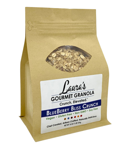 Every crunchy yet chewy bite bursts with the singular sweetness of blueberries in pure harmony with hints of citrus and vanilla, a touch of organic coconut oil and the depth of organic blue agave nectar. Created in 2020 when the world needed a little extra bliss, the newest flavor of the Laura's Gourmet Granola lineup has taken the granola world by storm. Enjoyed as part of a healthy lifestyle for breakfast, as a snack or baked into your favorite scone or muffin.Ingredients