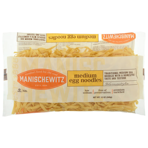 Traditional medium egg noodles with a homestyle taste and texture. Low sodium. Comfort food for the soul. Estd 1888. Free of preservatives. Premium enriched. Celebrating 130 years of crafting kosher foods. manischewitz.com. Twitter, Instagram: (at)manischewitzco. Facebook, pinterest: (at)manischewit. For product information and more, log on to: manischewitz.com. Product of USA.